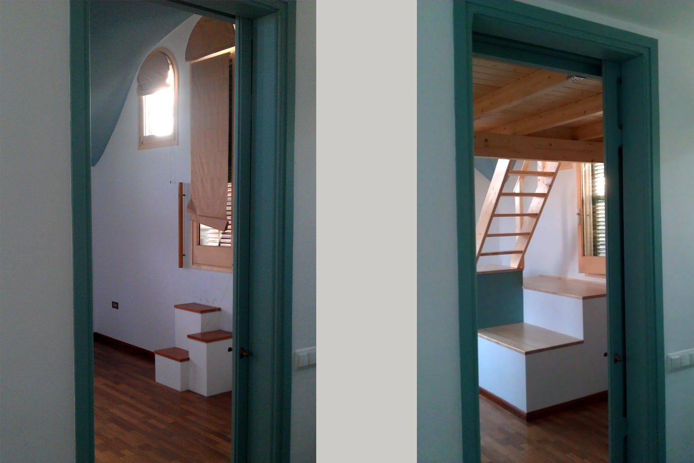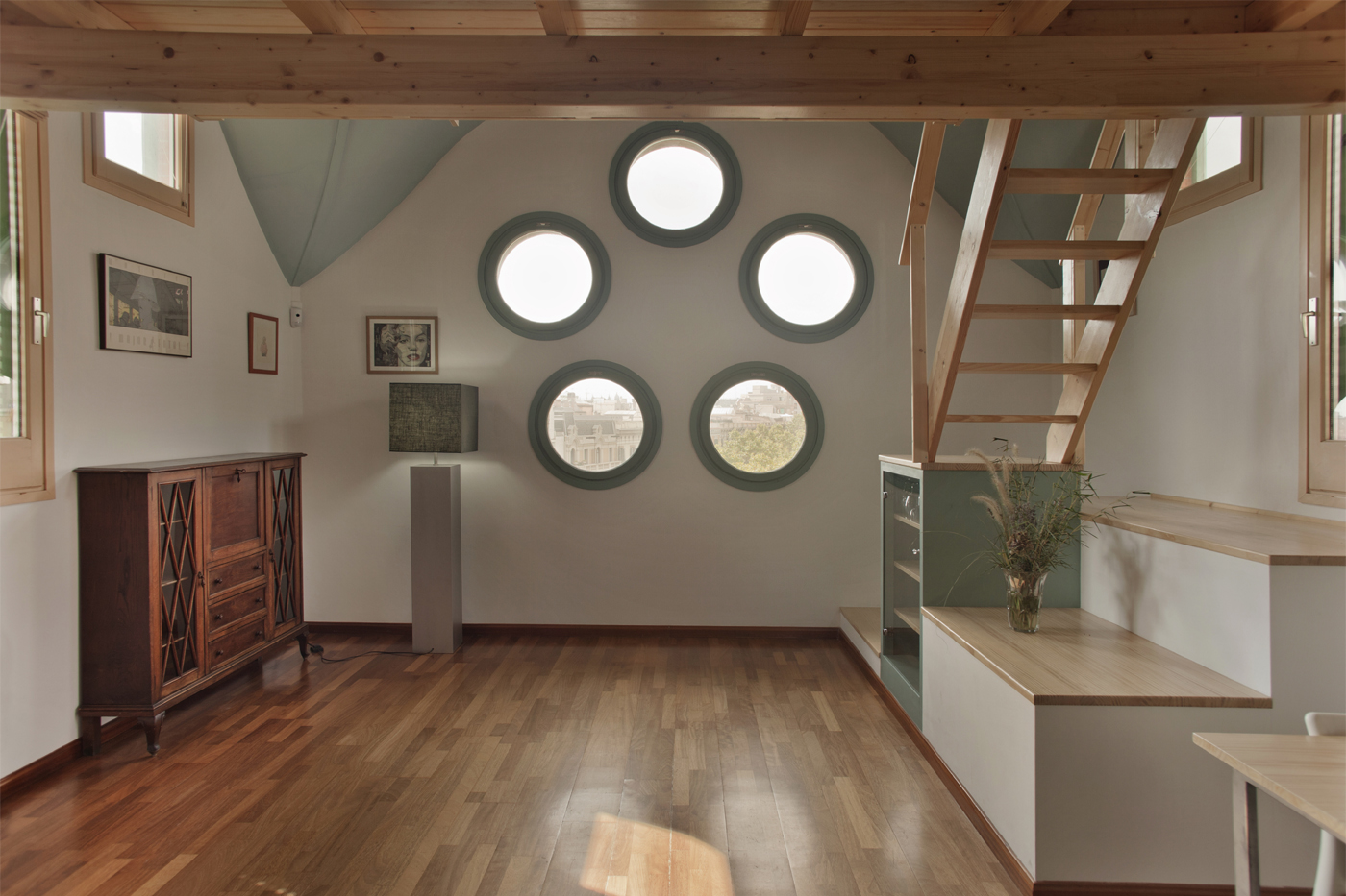 Situada en un edificio catalogado, nos pidieron asesoramiento para obtener mas espacio y funcionalidad en ésta cúpula modernista, sin perder la estética y los rasgos que la caracterizan. Un reto ciertamente importante y comprometido, pero no por ello menos interesante. Planteamos un dormitorio elevado liberando así la zona del estar-comedor, dado que teníamos altura más que suficiente para ello. Construido únicamente en madera, tanto por la calidez y la nobleza de la misma, como por lo liviana de la intervención. Otro factor que nos planteamos, fue que la intervención fuese poco invasiva, es decir que se pudiese desmontar y recuperar el estado original de la misma. Creemos que obtuvimos un magnífico resultado, podéis observar las fotos de antes y después de la intervención y juzgar vosotros mismos.