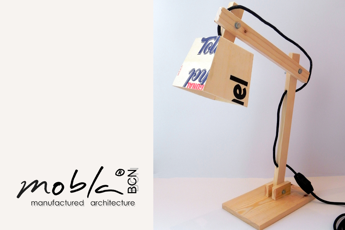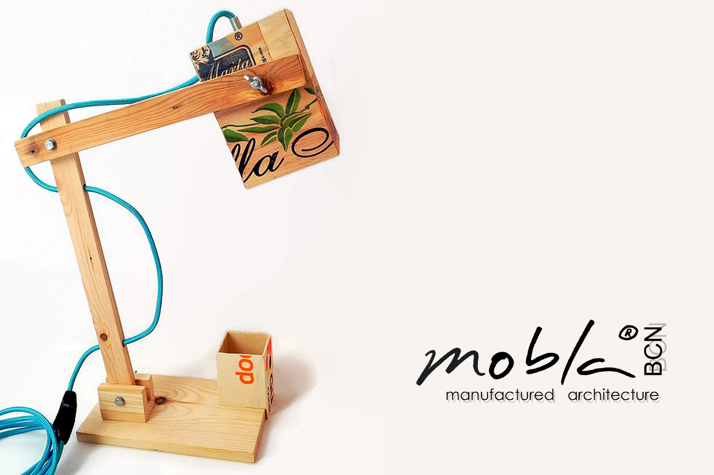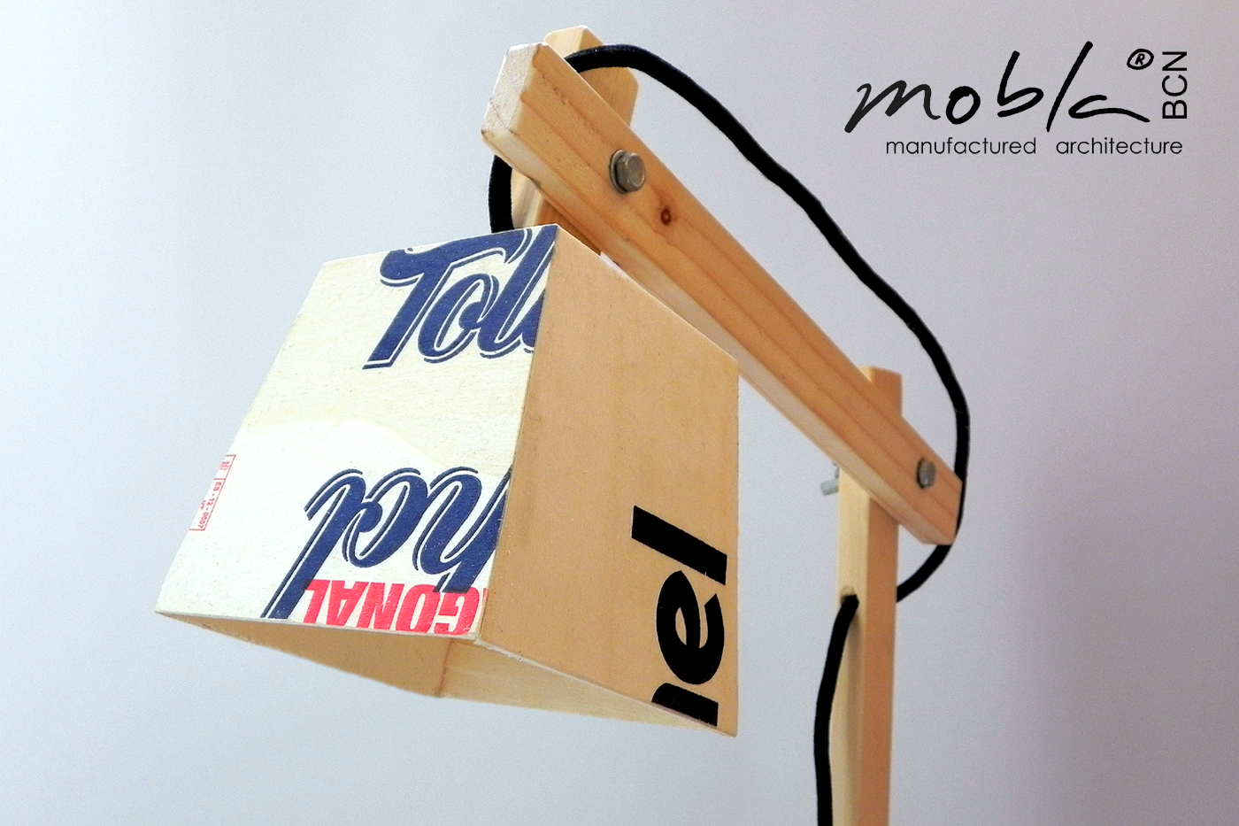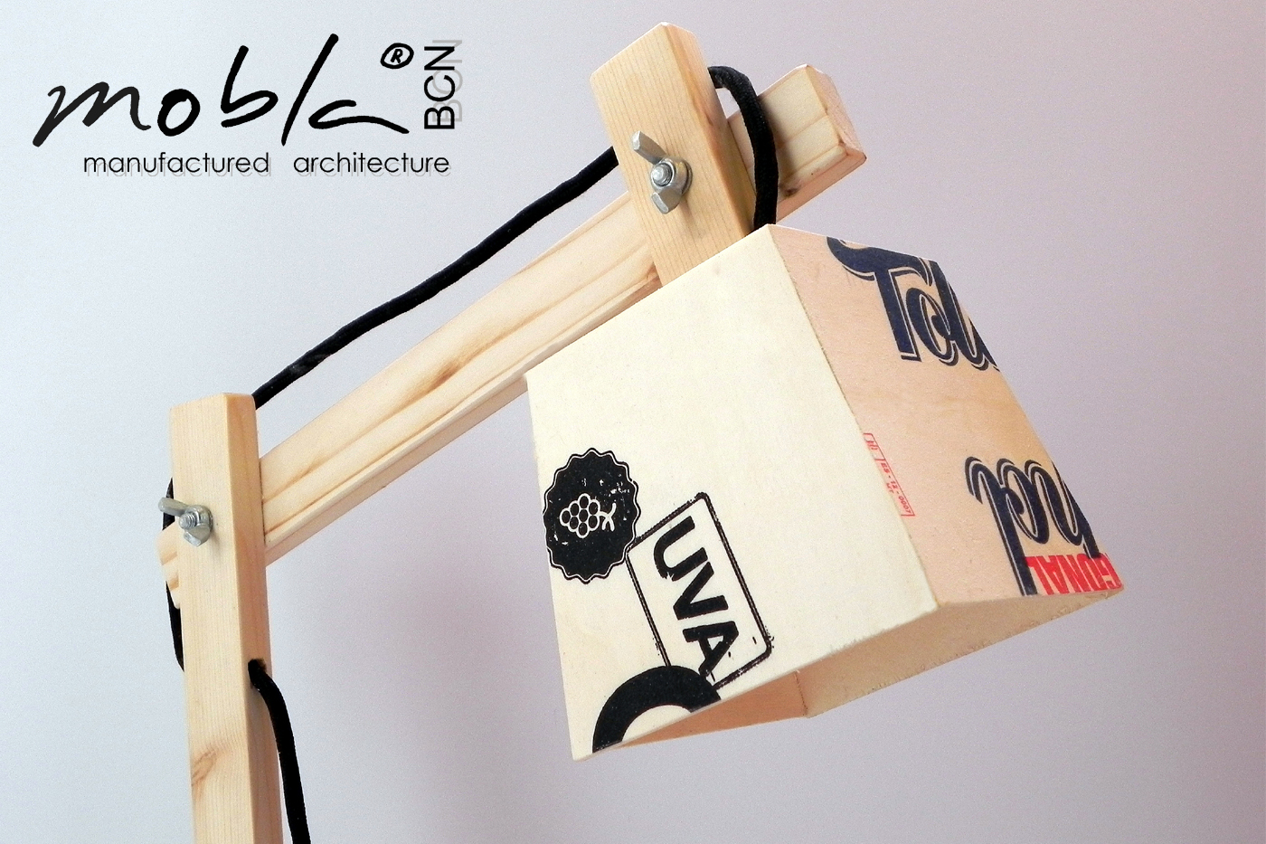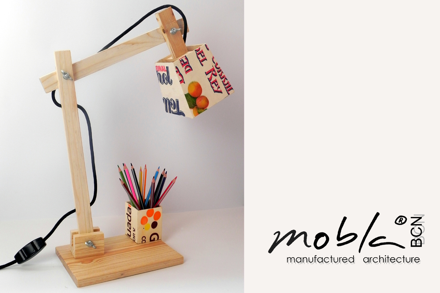 Lámparas de mesa con madera reciclada de palé y cajas de fruta, las encontraras en dos versiones, con pie giratorio o fijo, pantalla rectangular o inclinada, y la posibilidad de incorporar o no, un práctico portalápices.