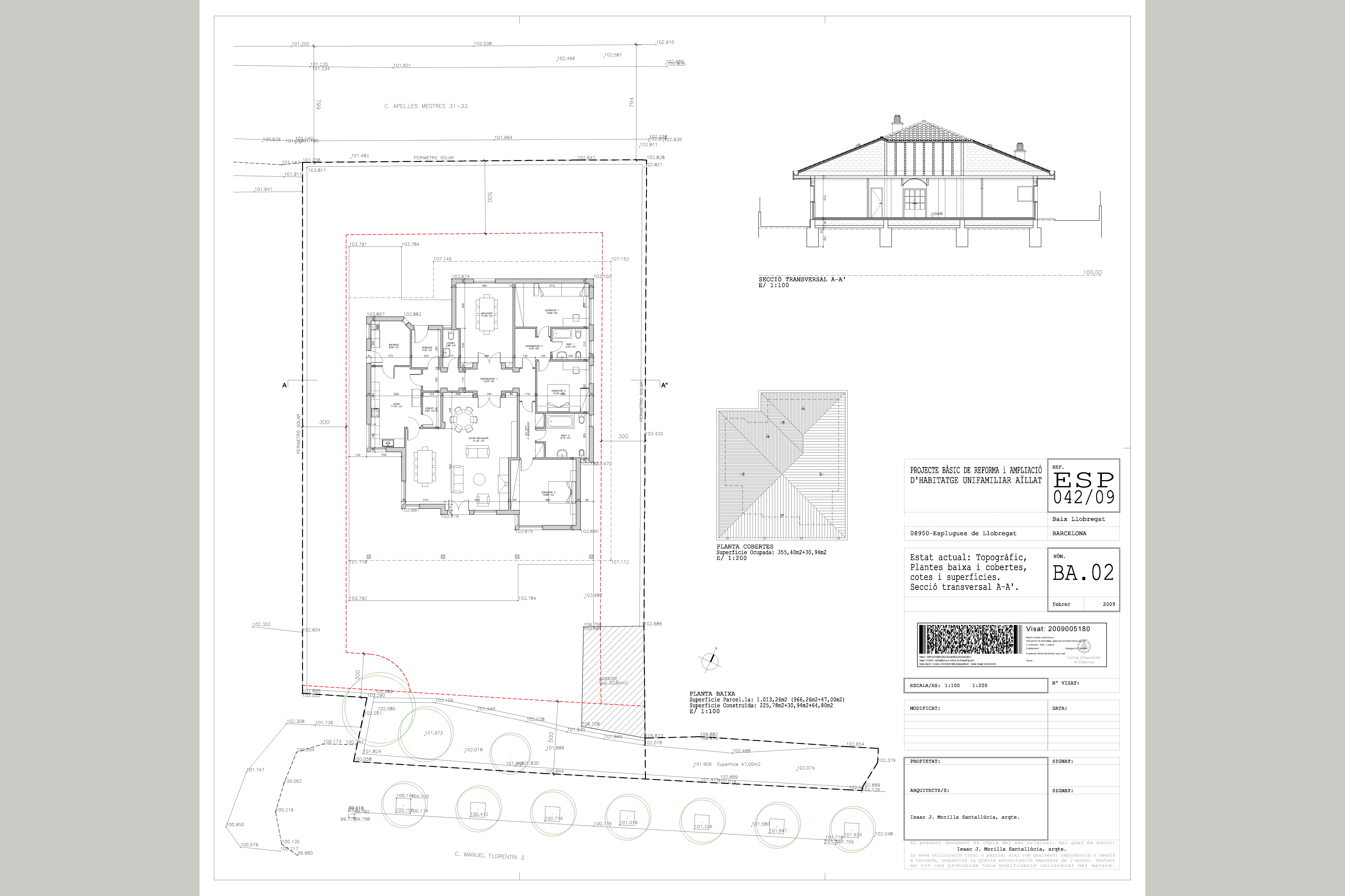 Proyecto de reforma y ampliación de una vivienda unifamiliar en Esplugues de Llobregat, ubicada en un solar de unos 1000 m2 y una construcción existente de 250 m2, se proyectó una remonta de otros 250 m2 así como un sótano para aparcamiento de 3 coches, ascensor, 6 dormitorios en suite, sala de estar con diversos ambientes, una gran cocina y diversas salas de ocio para la familia, todo ello situado alrededor de un patio central que ventilaba y daba luz a gran parte de las estancias de la casa.