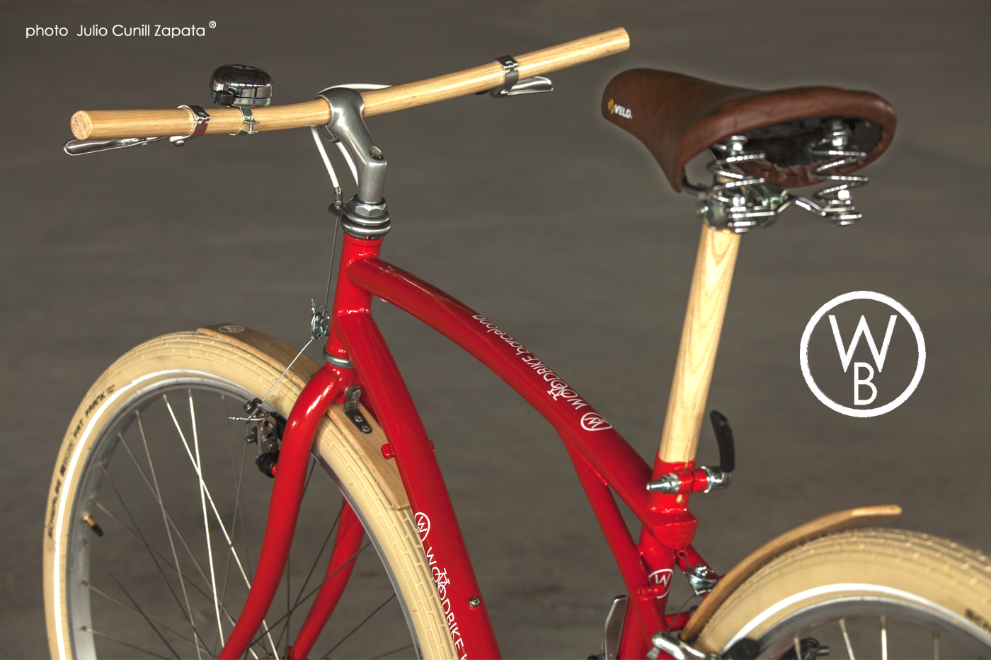 Preciosa GT Streamline recuperada y personalizada en un contundente color rojo, cubiertas Flat Frank de Schwalbe, bielas Sturmey Archer y todos los demás accesorios realizados en madera de fresno laminada.